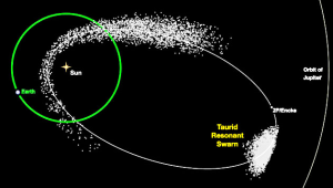 مدار دنباله دار انکه (ENCKE) حول خورشید. در مدار این دنباله دار بچز مواد ریز بجای مانده از گیسو، شامل توده های فشرده ای از اجرام کوچک و بزرگ است که با توجه فصل مشترک مدار آنها با زمین، می توانند حادثه آفرین باشند. Credit: David Clark / Univ. of Western Ontario